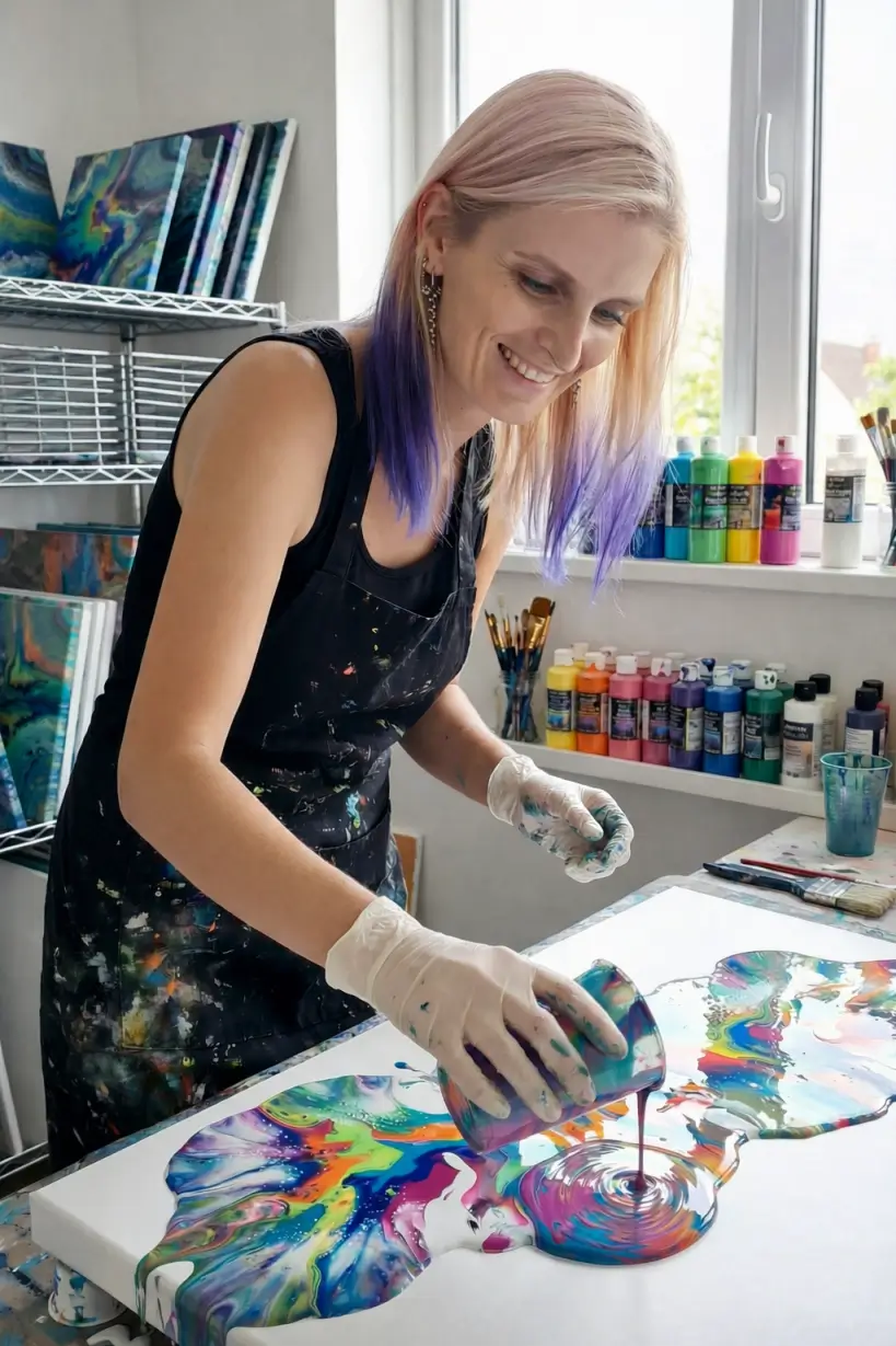 Nazywam się Sylwana Ciepiela i jestem artystką, która… wylewa obrazy. Tak, dobrze przeczytałaś – wylewam farby na płótno i tworzę z tego magię!